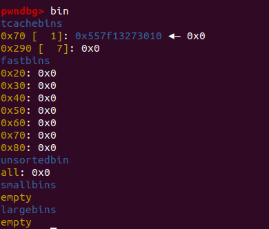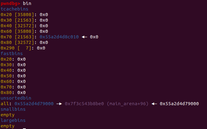 这里需要格外注意的是,这里并未直接将改tcache_num设置为7 ,而是利用tcache和unsortbin的指针指向相差了0x10,因此被分配到最高地址的chunk被free时将会进入unsortbin,而其上一个被free的chunk仍进入tchche这为之后修改tchche的fd提供了方便
