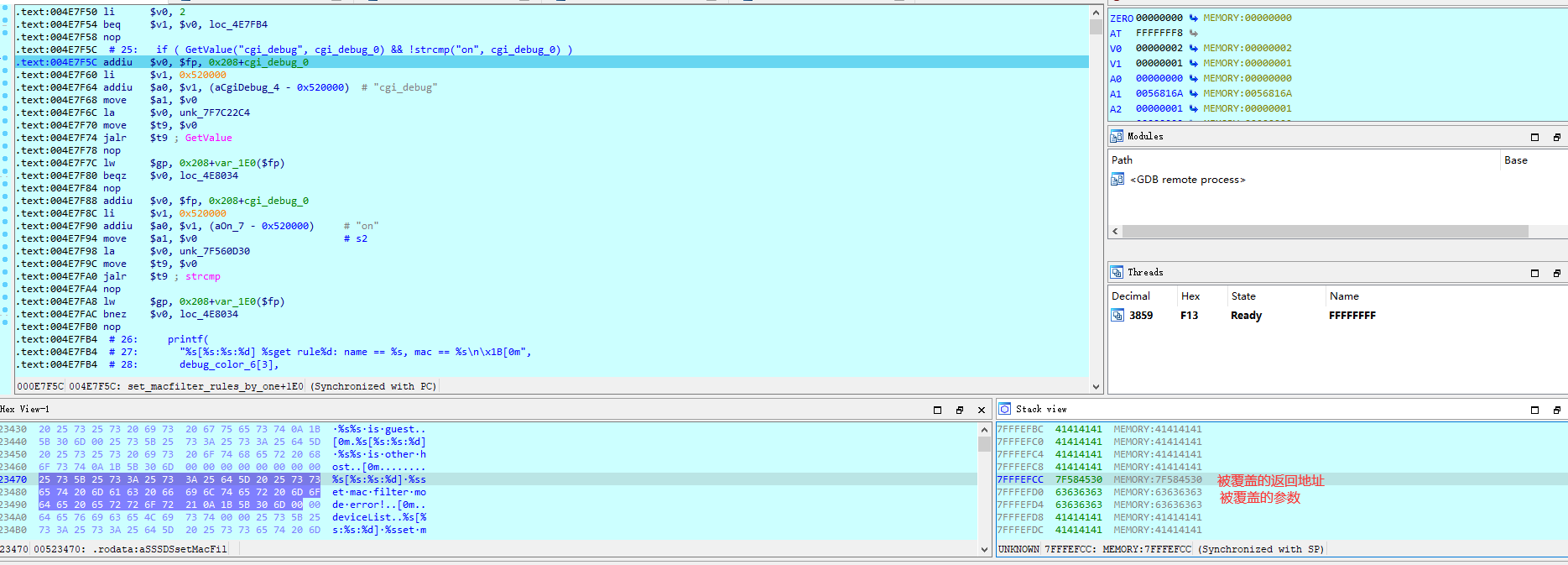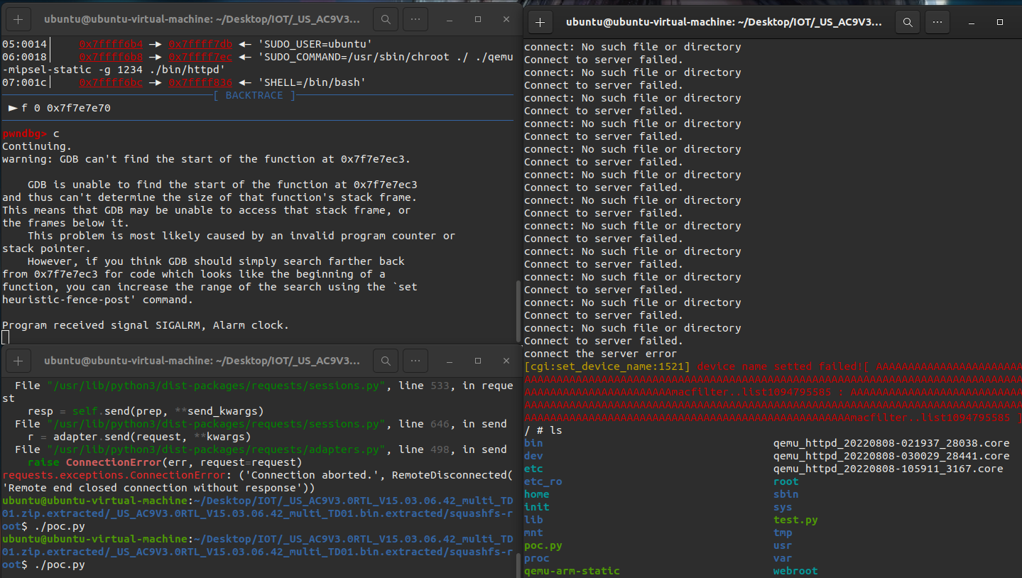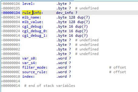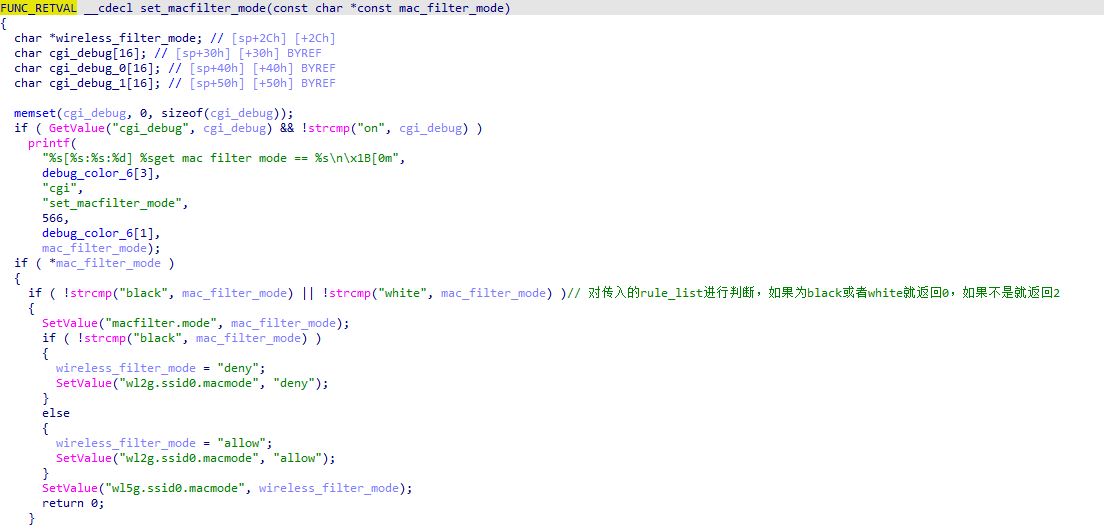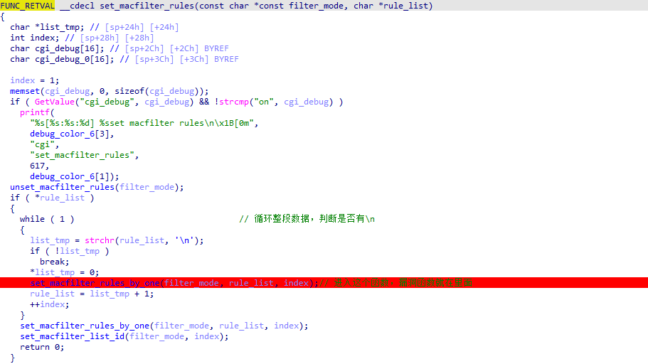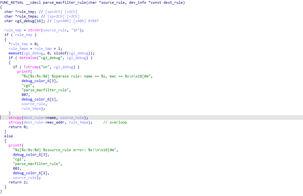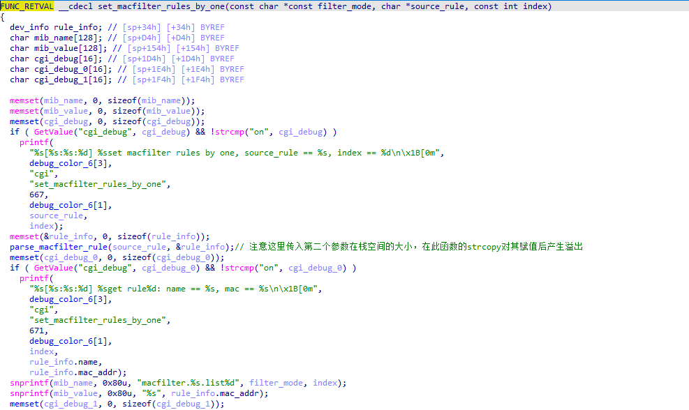 漏洞函数就是strcpy中,因为没有限制长度而存在的溢出,从而在上一个函数set_macfilter_rules_by_one引发栈溢出。