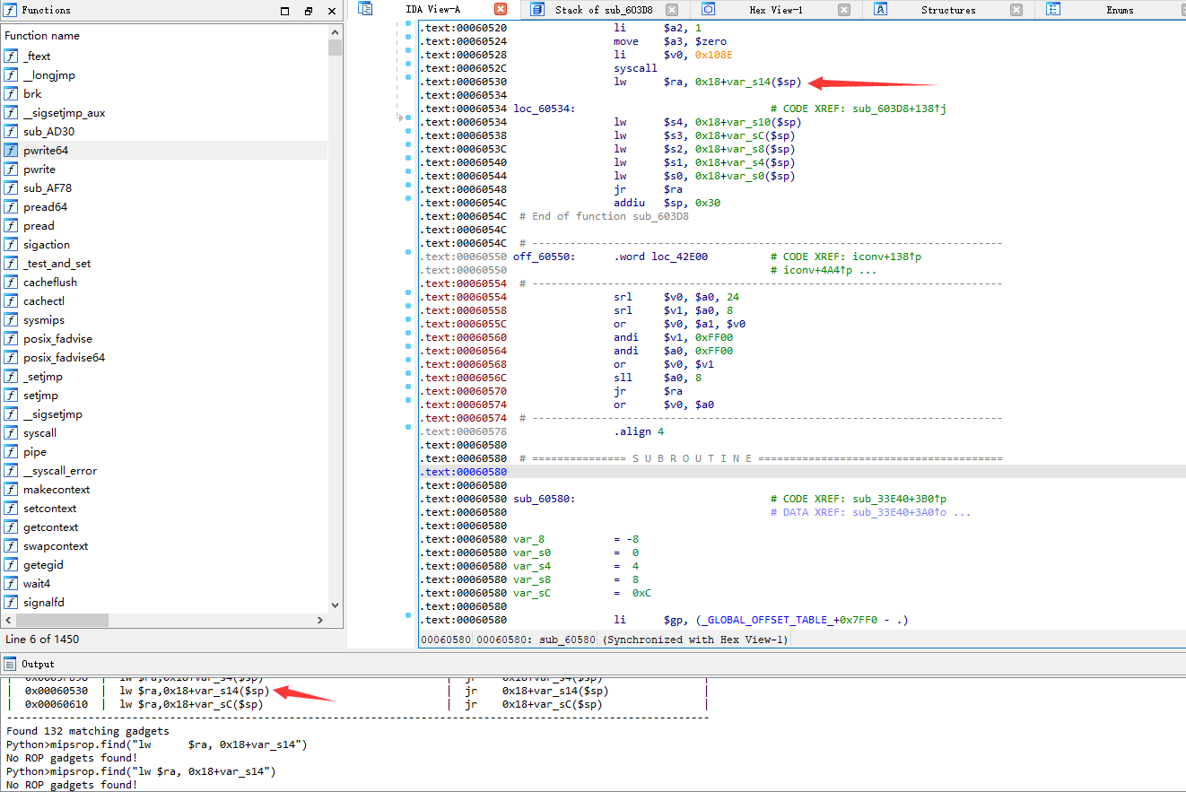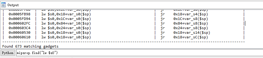 同样,我们为了寻找给s0,s1赋值的gadget ,可以输入mipsrop.find(“lw $s0”)