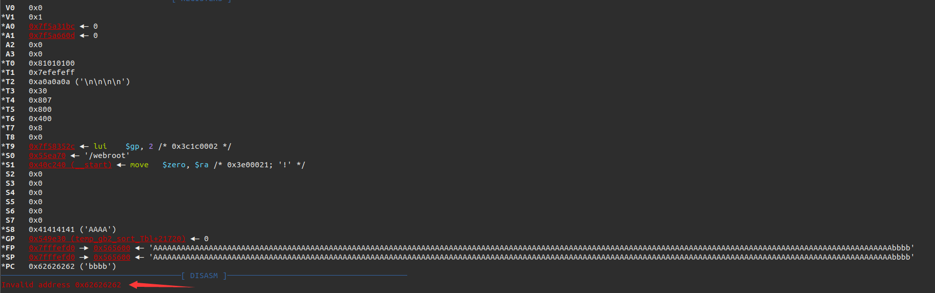 对比可以发现,我们覆盖掉了上一函数传入的参数,而在执行snprintf的时候会用到所传入的参数,所以我们需要把传入的第一个参数修改为一个可以访问的地址