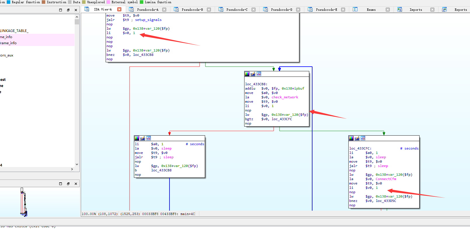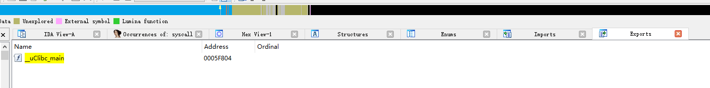 发现栈中有一个来自libc中的函数。我们在libc里面寻找__uClibc_main ,在export导出表找到了。