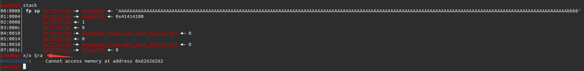 可以看见ra被覆盖为了bbbb,这就说明我们的计算是正确的。