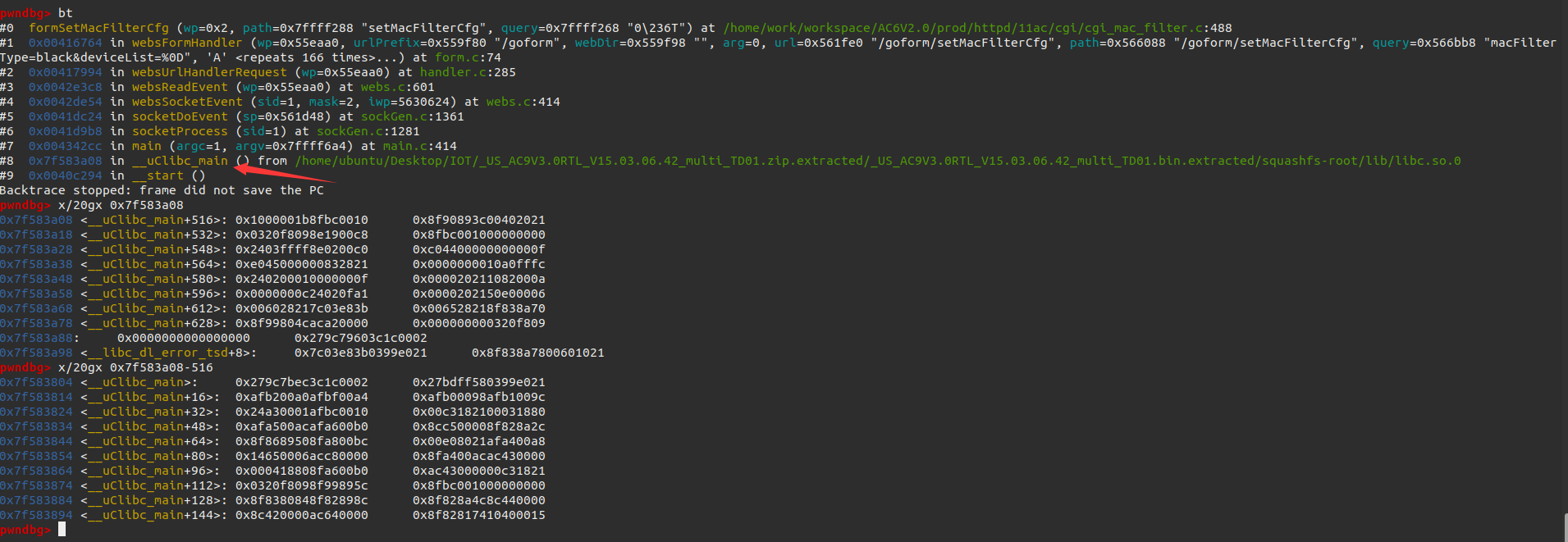 在刚进入formSetMacFilterCfg函数时,也即0x04E6E0C处打下断点。用bt查看栈中函数链