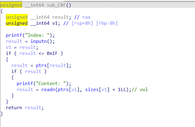 漏洞出现在edit中,因为在读入时多出了一个字符,所以造成了off-by-one 漏洞。