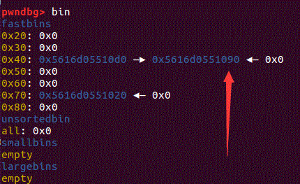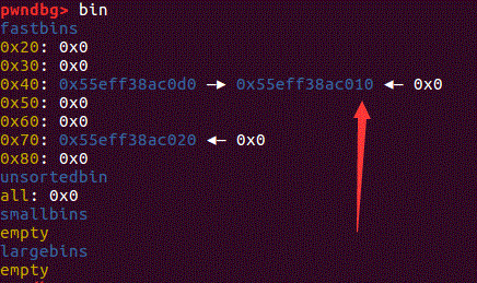 利用uaf漏洞修改fd指向fake_chunk,将chunk分配至fake_chunk处,并且利用fake_chunk修改下一chunk的size域。