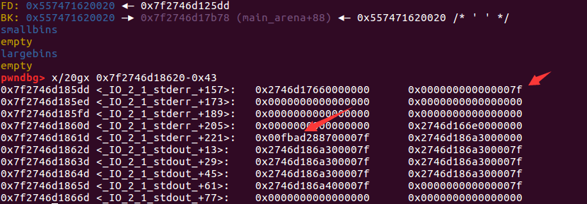 free该chunk,使其进入unsortbin ,其fd指向main_area 。利用fake_chunk修复该chunk。并且利用uaf漏洞修改unsort_chunk的fd指向目标位置。这里需要爆破一位数也就是1/16的概率。查看stdout可以使用 打印 “p /x _IO_2_1_stdout_”