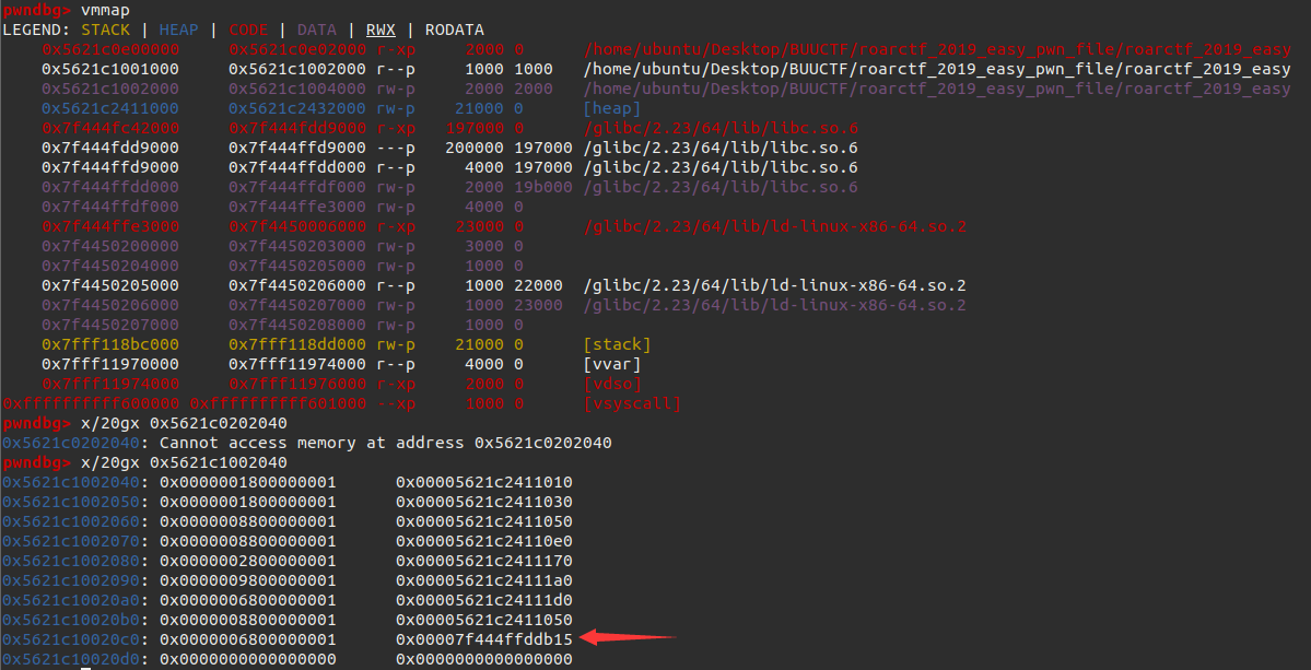 利用double_free漏洞可以实现fastbin_attack.可以通过vmmap看到这个chunk_8被分配到了__malloc_hook附近
