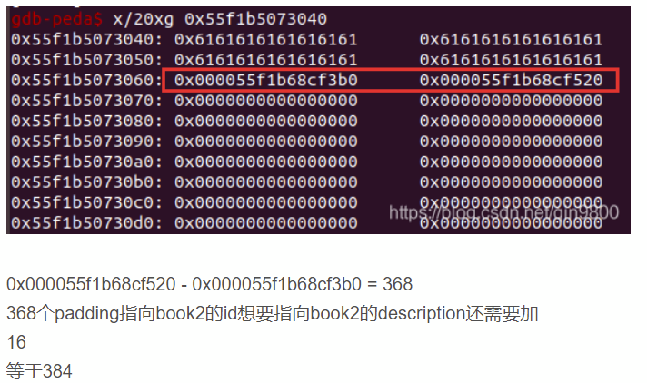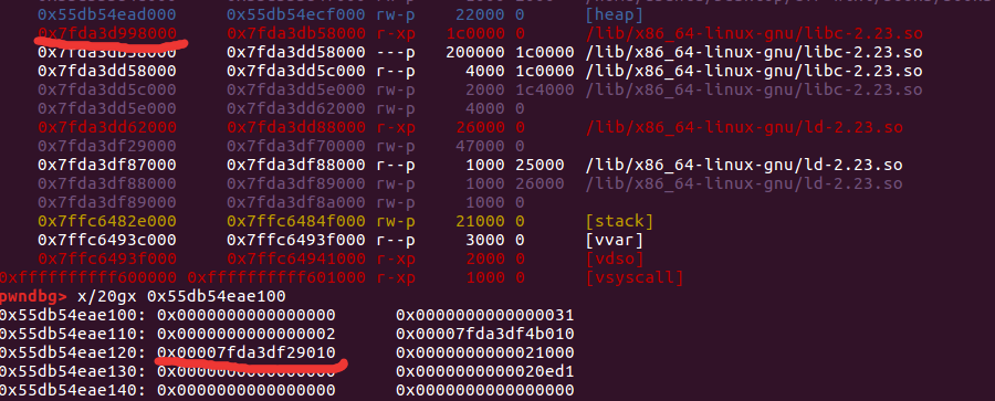 那么我们先create两个book,经过调试发现,当name_size为0x20时ptr_des的位置符合需求。而第二个book有通过vmmap泄露libc_base 的功能,所以需要很大的空间,使系统单独映射一段内存从而泄露libc