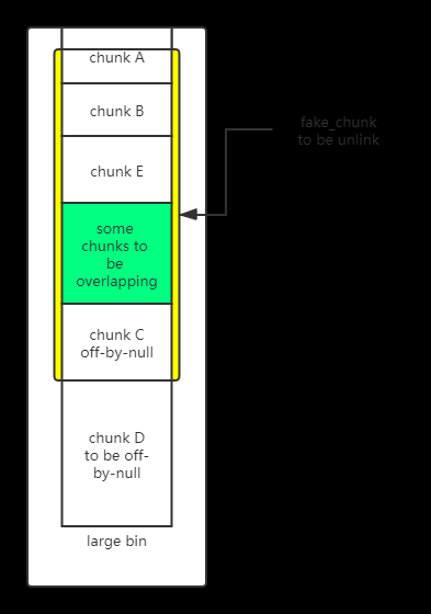 所以fake_chunk必须可以控制其size,fd,bk使其 FD->bk == p ; BK->fd == p 。 之后通过溢出修改某一chunk(D)的prevsize和inuse位为\x00 ,此时free(D)与p 形成合并,p与其FD,BK进行unlink操作。即可形成overloap