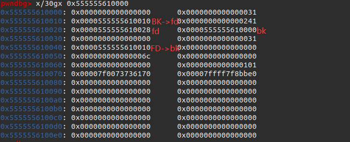 此时BK->fd还没有修复好,为了在修复的同时不破坏掉size,需要把它放入fastbin.同时为了利用地址信息需要把 B , C , A 依次free掉